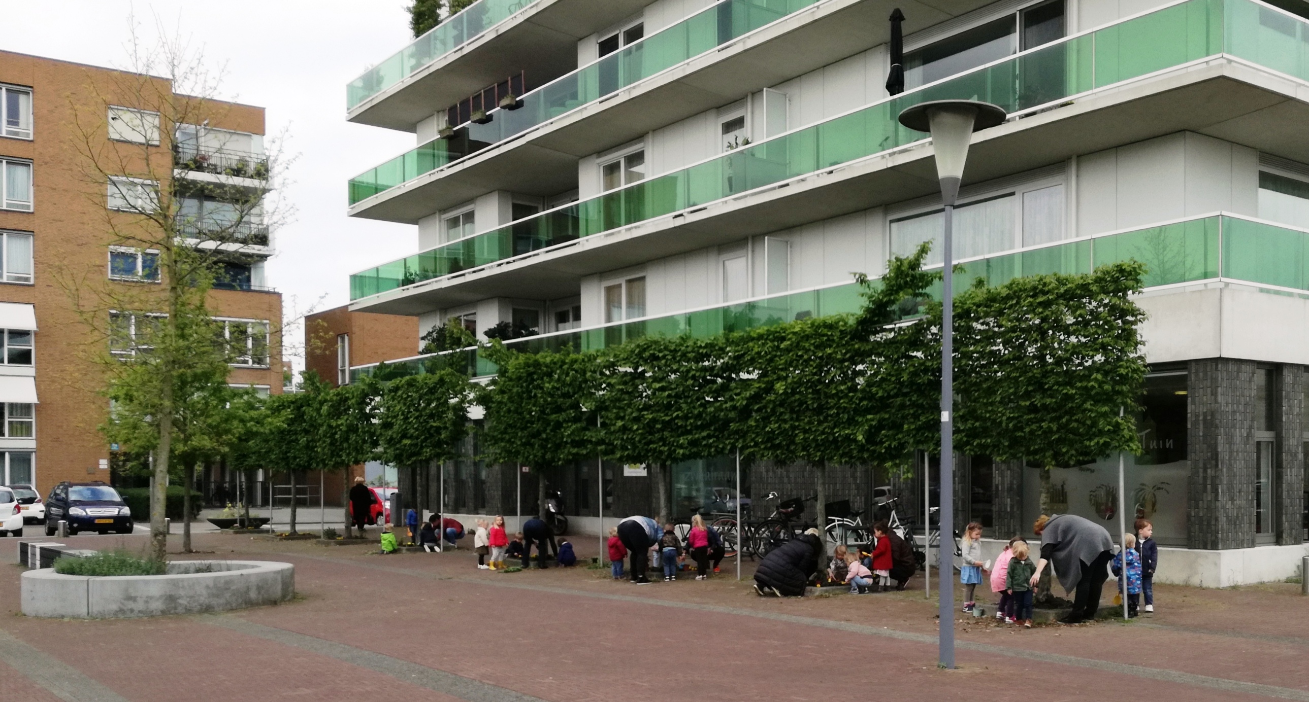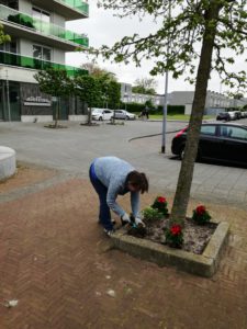 Op woensdag 10 mei hebben we samen met de partijen, die aan het plein zitten, het Minervaplein opgefleurd met plantjes in de boomspiegels. Jammer dat er niet veel bewoners bij waren, maar gelukkig des te meer kinderen van het kinderdagverblijf Hillegonda’s tuin.