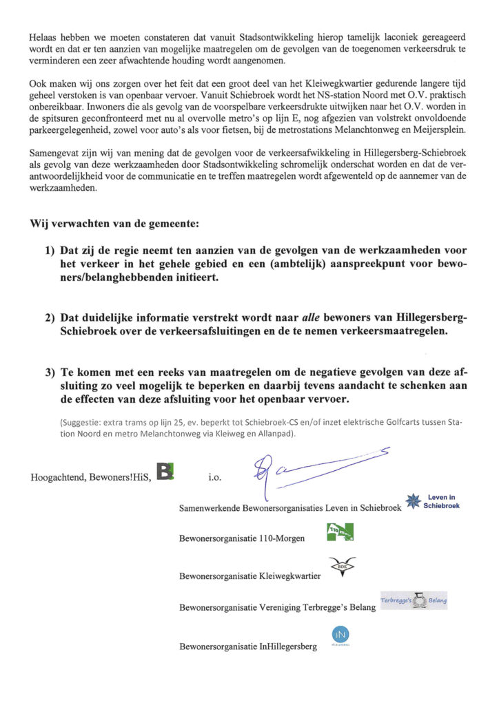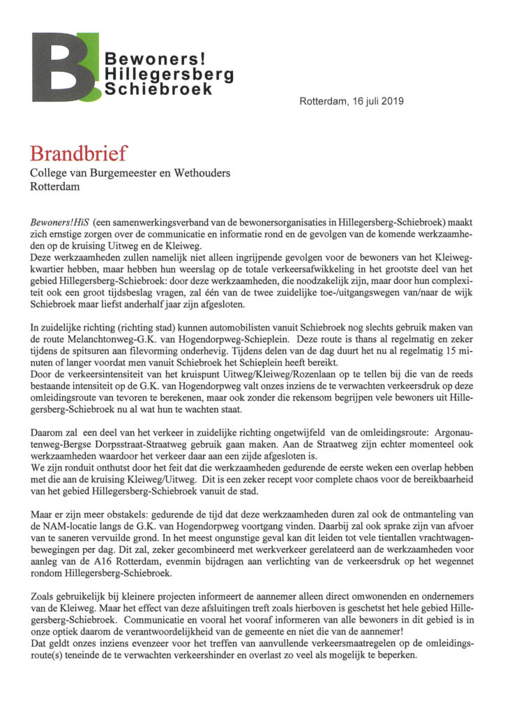 Brief aan college werkzaamheden Kleiweg-Uitweg